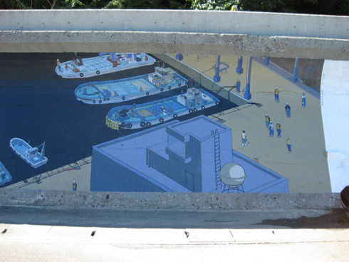 毎夏のさざなみという恒例行事で一週間住み込みで七尾市のさざなみ漁港というところで壁画を制作をしてきたのです。 112メートル×2メートルの壁にを3年くらいかけて絵を描く予定。今年はそのうちの25メートルくらいを9人で制作してきました。