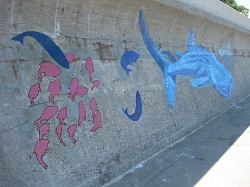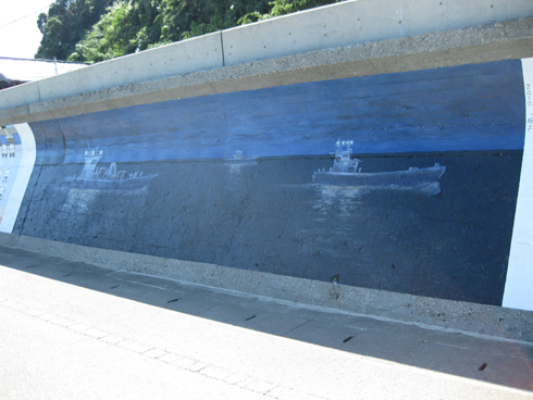 毎夏のさざなみという恒例行事で一週間住み込みで七尾市のさざなみ漁港というところで壁画を制作をしてきたのです。 112メートル×2メートルの壁にを3年くらいかけて絵を描く予定。今年はそのうちの25メートルくらいを9人で制作してきました。
